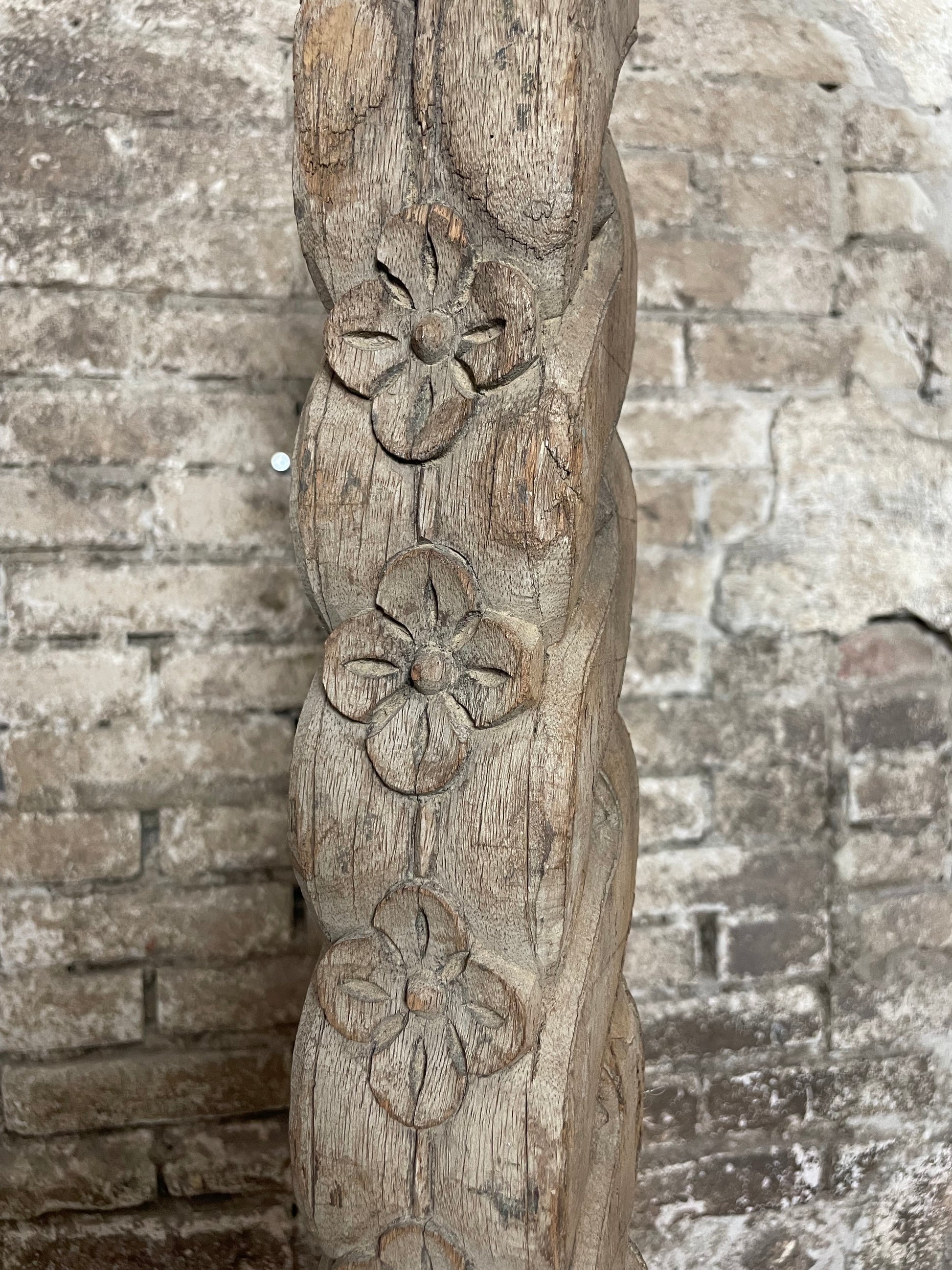 Prachtige, authentieke houten pilaar afkomstig uit India, volledig met de hand vervaardigd. Deze decoratieve zuil is rijkelijk gesneden met florale motieven en toont het vakmanschap van traditionele Indiase houtbewerkers. Elk detail is uniek en draagt bij aan de warme, karaktervolle uitstraling.