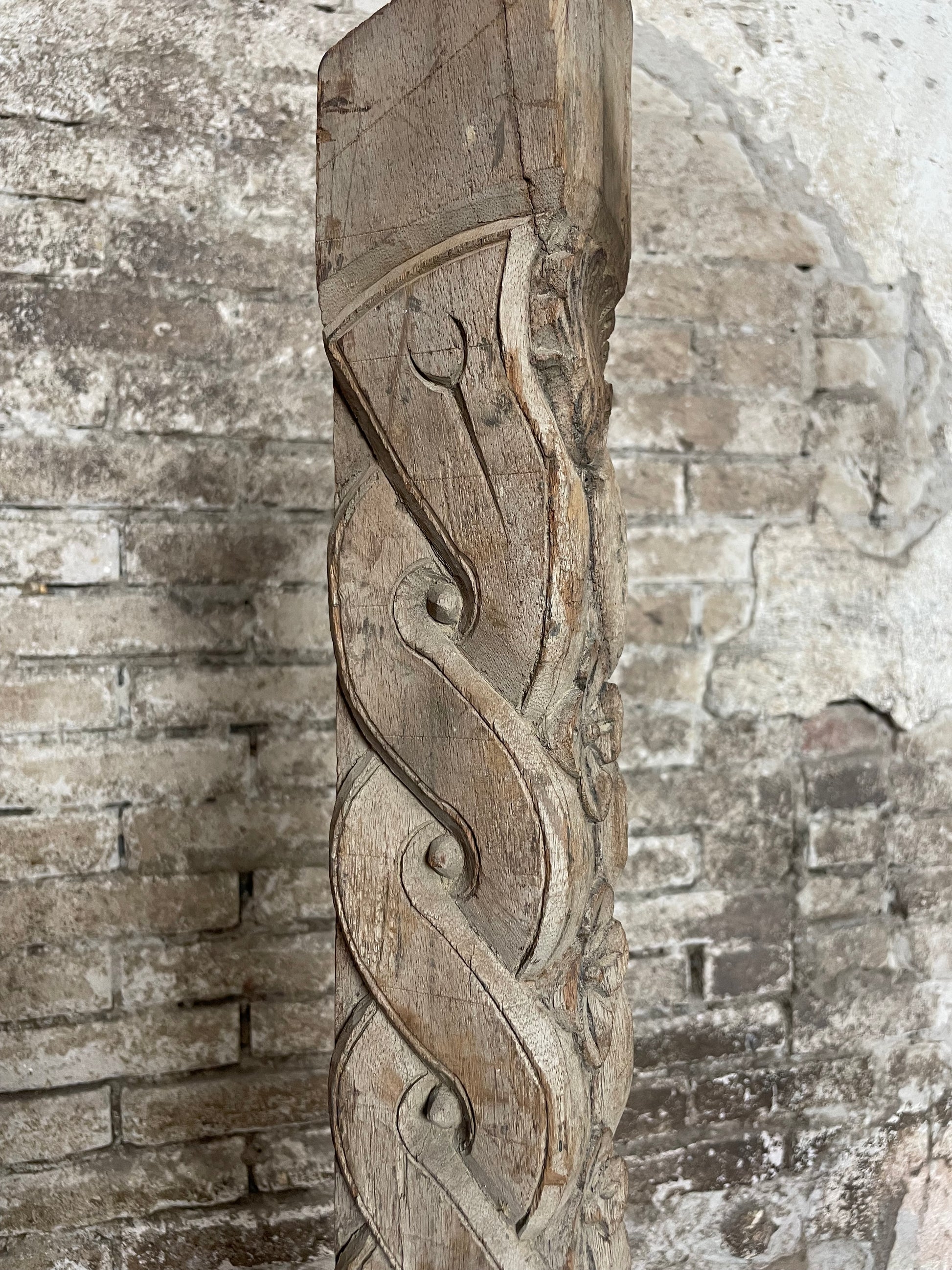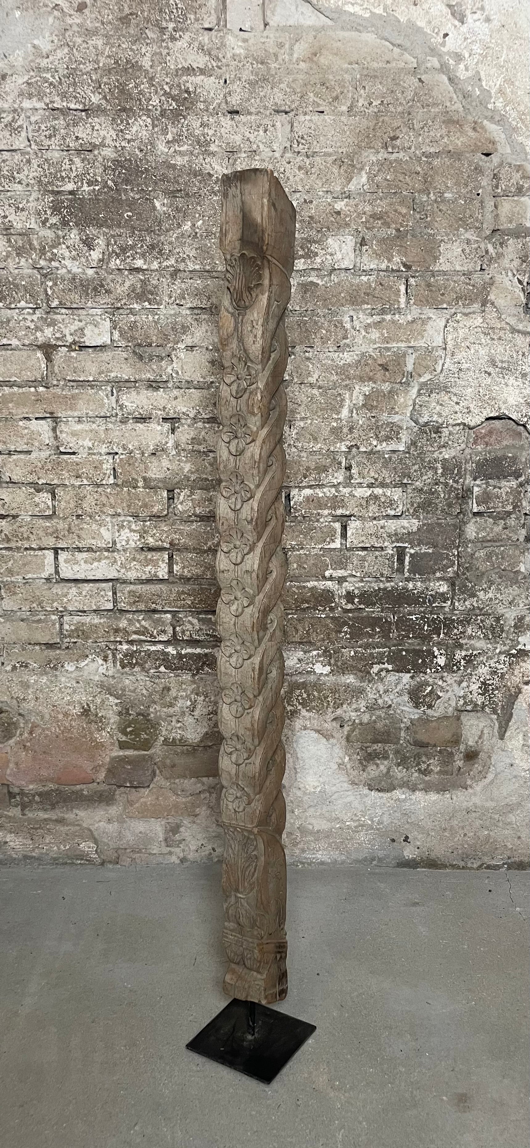De pilaar staat op een stevige metalen voet, waardoor hij los te plaatsen is als kunstobject in een interieur, winkel, galerie of overdekte buitenruimte. Door de doorleefde uitstraling en het ambachtelijke snijwerk is dit een echte blikvanger met een verhaal.